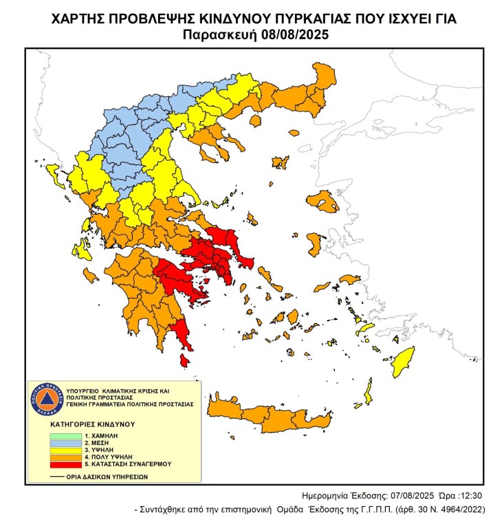 γ) τον Ημερήσιο Χάρτη Πρόβλεψης Κινδύνου Πυρκαγιάς για την Παρασκευή 08/08/2025 που κατατάσσει την ΠΕ Θάσου στην κατηγορία κινδύνου 4 Πολύ Υψηλή,