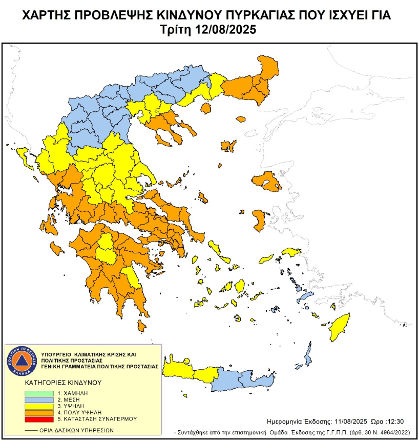 γ) τον Ημερήσiο Χάρτη Πρόβλεψης Κινδύνου Πυρκαγιάς για την Τρίτη 12/08/2025 που κατατάσσει την ΠΕ Θάσου στην κατηγορία κινδύνου 4 Πολύ Υψηλή,
