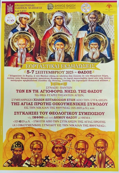 Η Ιερά Μητρόπολη Φιλίππων, Νεαπόλεως και Θάσου και ο Δήμος Θάσου ανακοινώνουν ότι στο νησί της Θάσου θα πραγματοποιηθούν ιερές και επιστημονικές εκδηλώσεις με την ευκαιρία της Εορτής της Συνάξεως πάντων των Αγίων της Θάσου. Στο πλαίσιο του εορτασμού αυτού διοργανώνεται και το Α΄ Θεολογικό Συμπόσιο για την επέτειο 1700 ετών από την σύγκληση της Α΄Οικουμενικής Συνόδου στη Νίκαια της Βιθυνίας, με τη συμμετοχή διακεκριμένων θεολόγων, πανεπιστημιακών καθηγητών και ιστορικών, οι οποίοι θα αναπτύξουν θέματα που φωτίζουν την εκκλησιαστική ιστορία. Η Α’ Οικουμενική Σύνοδος καθιέρωσε την Ορθόδοξη Πίστη και την Εμπειρία της Εκκλησίας.