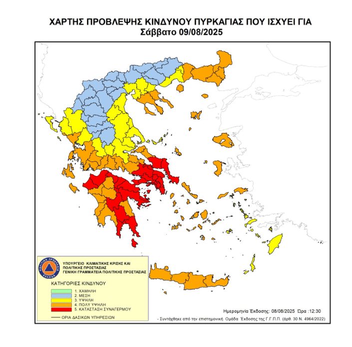 γ) τον Ημερήσιο Χάρτη Πρόβλεψης Κινδύνου Πυρκαγιάς για το Σάββατο 09/08/2025 που κατατάσσει την ΠΕ Θάσου στην κατηγορία κινδύνου 4 Πολύ Υψηλή,