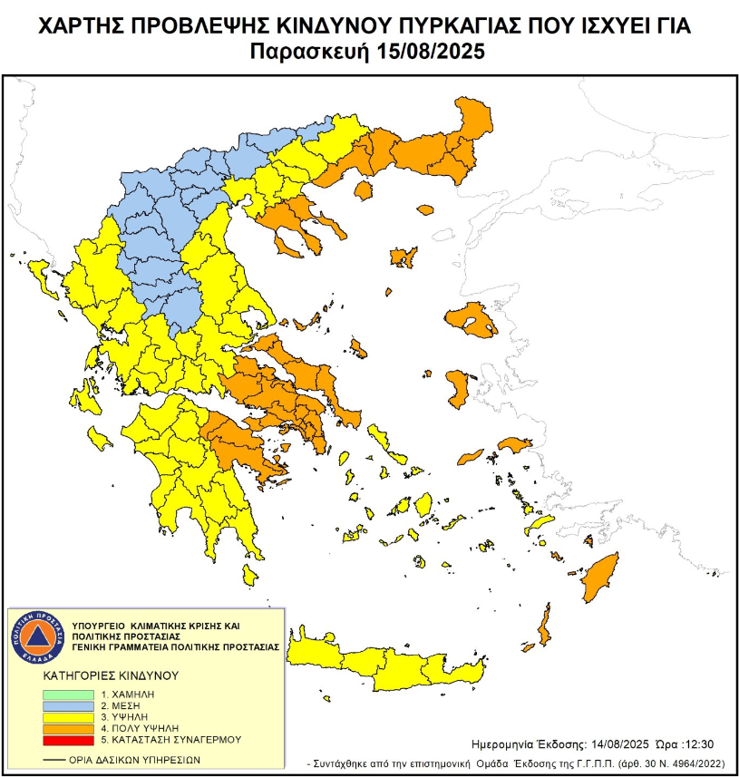 γ) τον Ημερήσιο Χάρτη Πρόβλεψης Κινδύνου Πυρκαγιάς για την Παρασκευή 15/08/2025 που κατατάσσει την ΠΕ Θάσου στην κατηγορία κινδύνου 4 Πολύ Υψηλή,