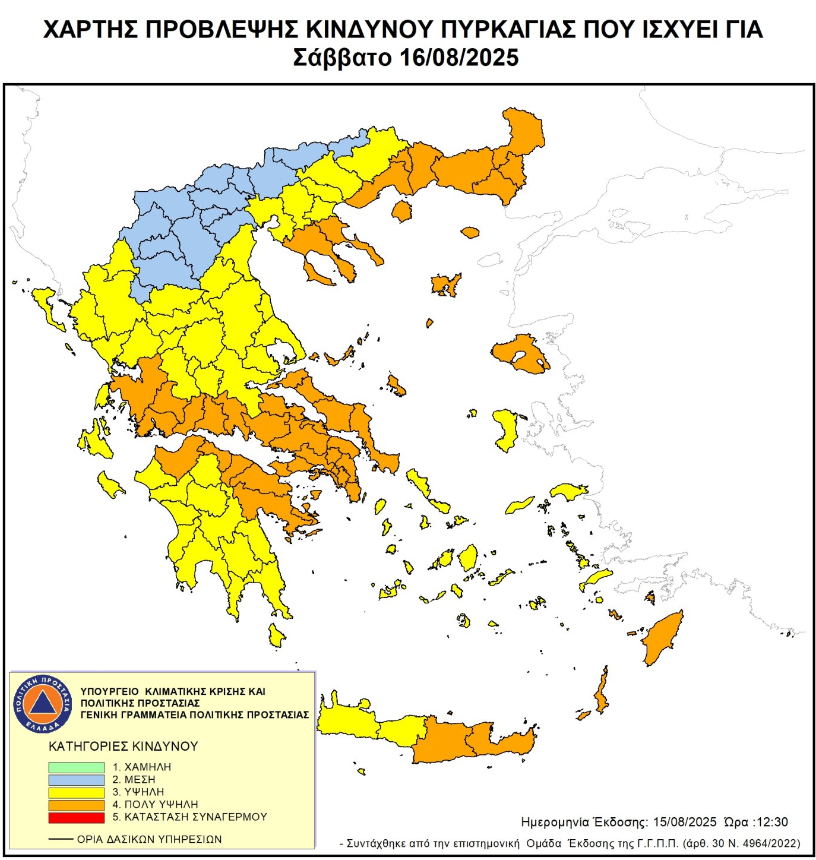 γ) τον Ημερήσιο Χάρτη Πρόβλεψης Κινδύνου Πυρκαγιάς για το Σάββατο 16/08/2025 που κατατάσσει την ΠΕ Θάσου στην κατηγορία κινδύνου 4 Πολύ Υψηλή,