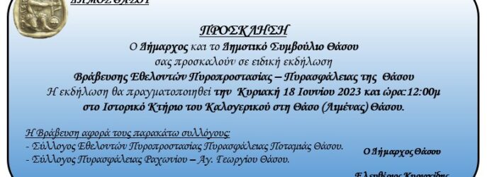 ΠΡΟΣΚΛΗΣΗ – ΕΚΔΗΛΩΣΗ Βράβευσης Εθελοντών Πυροπροστασίας – Πυρασφάλειας της Θάσου (18-06-2023 ΩΡΑ 12:00μμ)